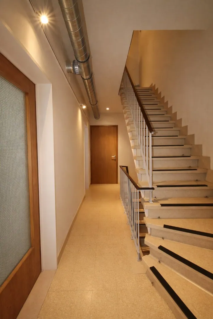 Via de gemeenschappelijke inkomhal (gedeeld met het kantoor op het gelijkvloers) bereikt men het appartement. Op het gelijkvloers beschikt het appartement over een aangename privékoer: een heerlijk rustige buitenplek midden in de stad.