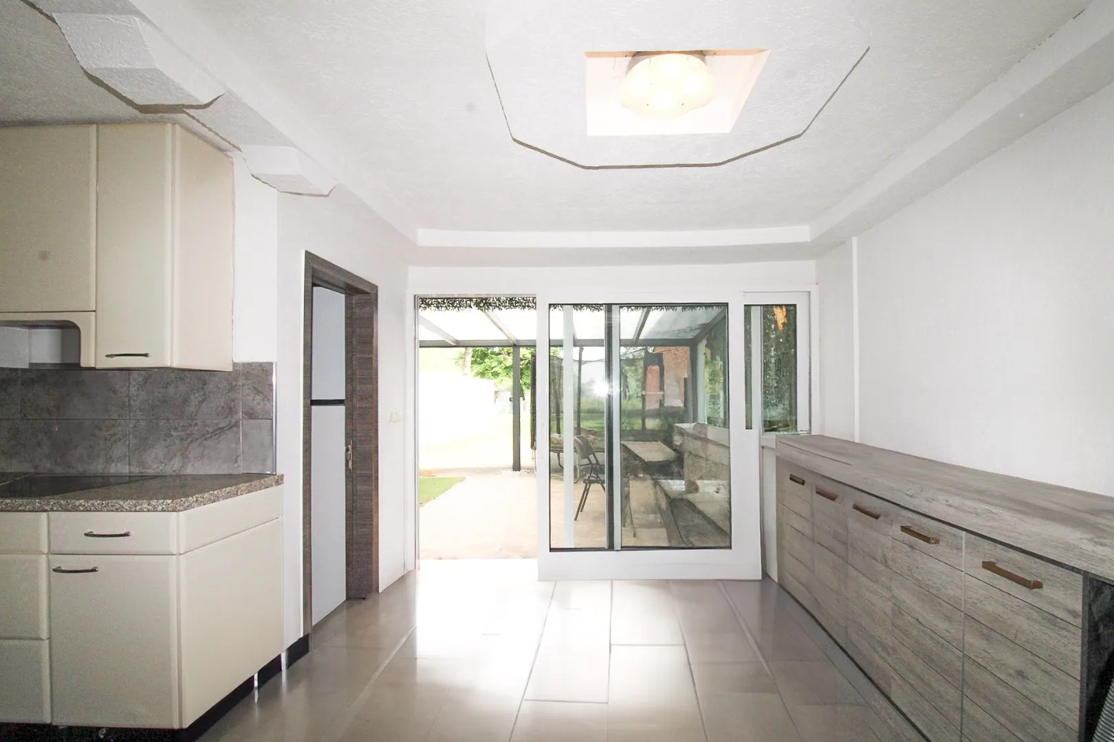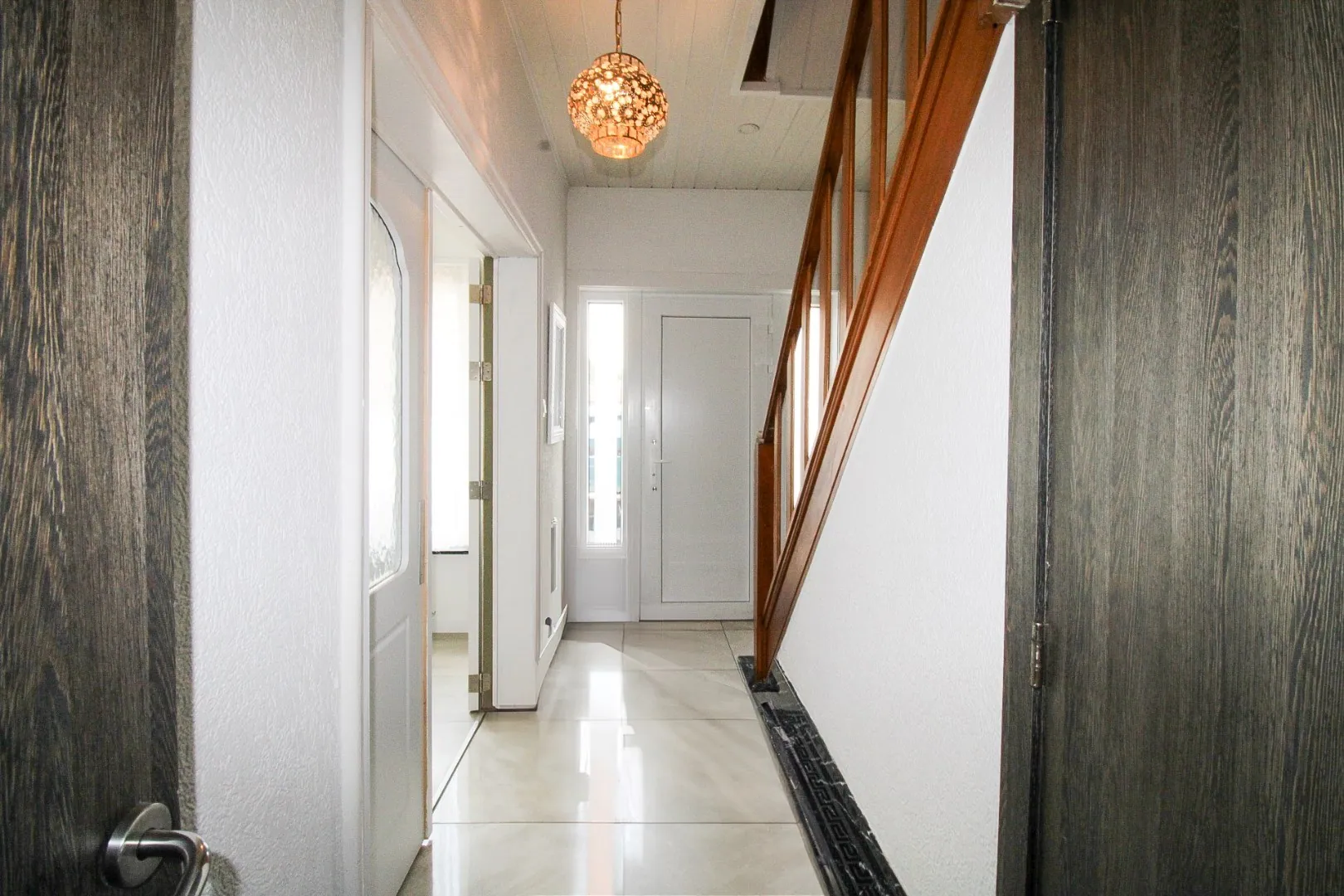 Bij het betreden van de woning komt u terecht in een gezellige, afgesloten leefruimte die rust en privacy uitstraalt. Aansluitend bevindt zich een praktische keuken, met daarnaast een aparte eetruimte, perfect voor familiemomenten of gezellige etentjes met gasten. Helemaal achteraan vindt u een tweede keuken en een eerste badkamer. De veranda vormt een prachtige overgang tussen binnen en buiten en loopt naadloos over in de diepe, groene tuin — een rustige plek om van het buitenleven te genieten, te ontspannen of het groene uitzicht in alle rust te bewonderen.