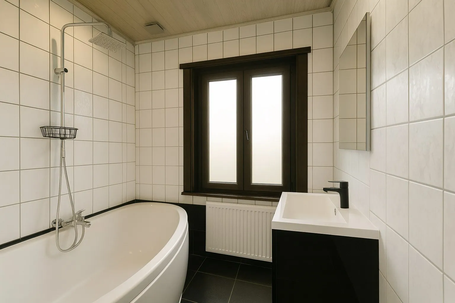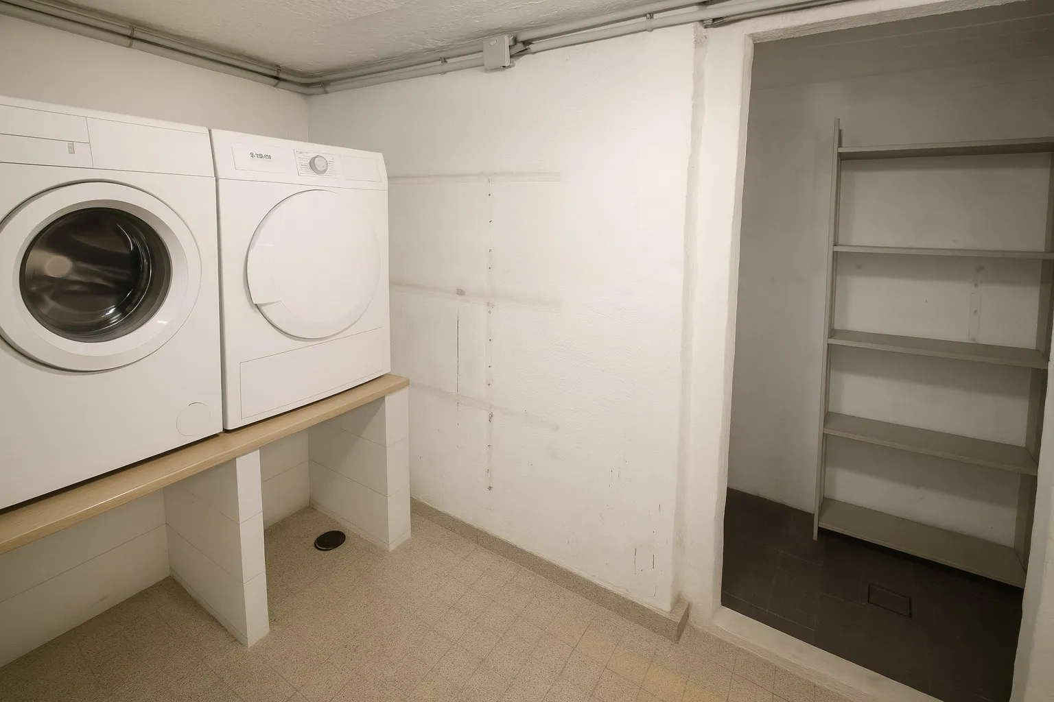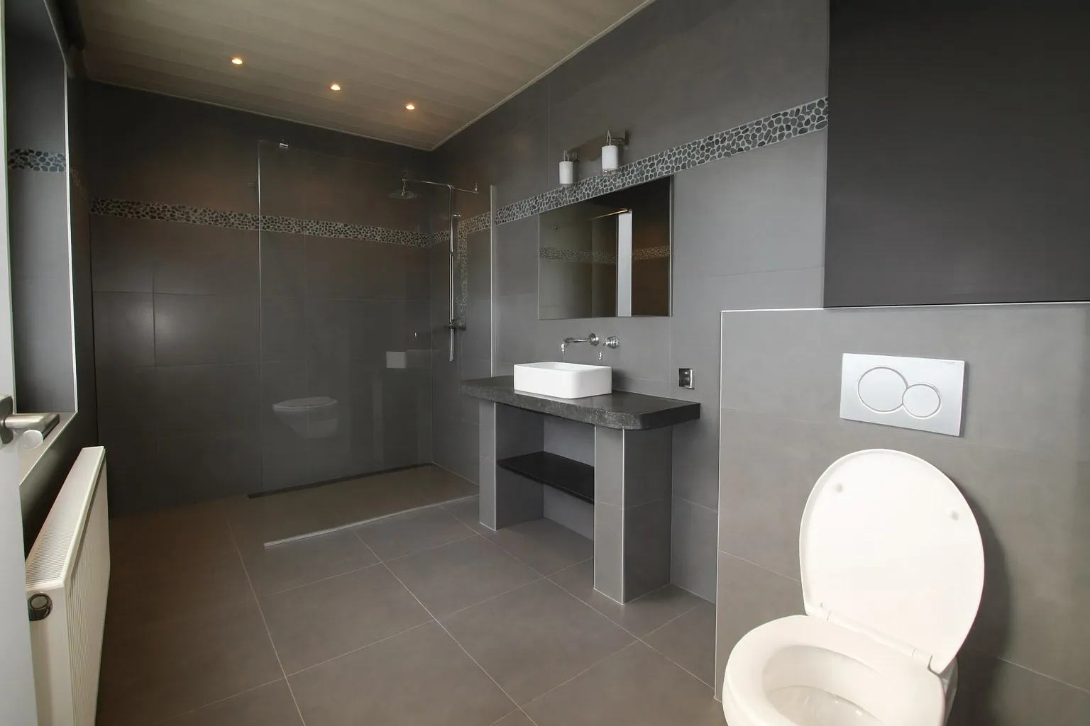 Achteraan de woning bevindt zich de eerste badkamer, voorzien van een ruime inloopdouche, een stijlvol lavabomeubel en een toilet. Aansluitend is er een handige extra opbergruimte, perfect geschikt voor het stallen van tuinmateriaal of andere benodigdheden. Deze bijkomende ruimte vormt een mooie aanvulling op het praktische karakter van de woning.